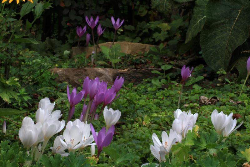In meinem schneckenkornfreien Garten sieht man recht gut, was unterschiedliche Standortbedingungen ausmachen, auch wenn sie nur 10 m auseinander liegen. Colchicum byzantinum ´Innocence´wächst unter einer Nyssa, im Schatten anderer Bäume, der Boden ist kahl und trocken. Dort mag sich offensichtlich keine Schnecke hin verirren.