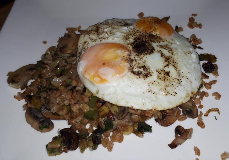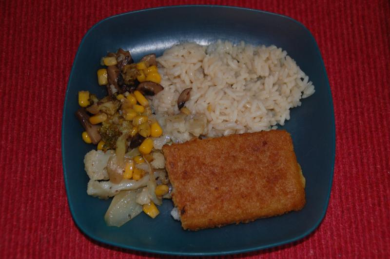 Heute gab es Reis mit Backfisch und Gemüsepfanne aus Broccoli, Blumenkohl, Mais und braunen Champignons.