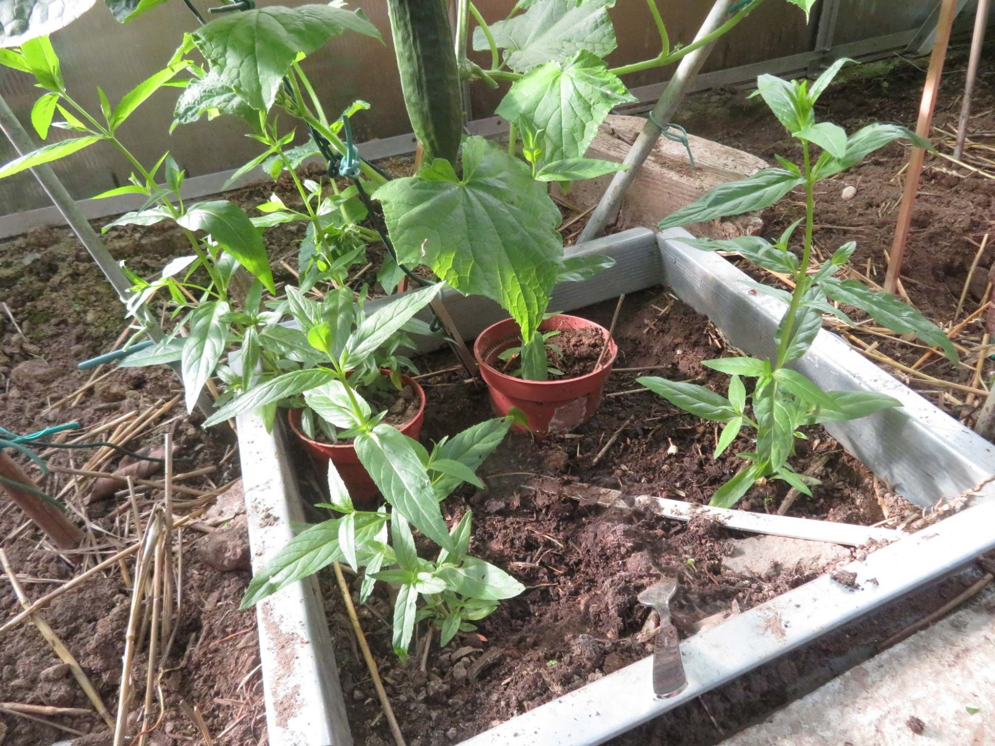 Hallo Apfelbauerin, betrifft die Schattierung im Sommer: Ich habe in meinem Gewächshaus experiementiert und habe für mich entschieden, dass die Schattierung aus einer Rebe besteht. Sie windet sich in einer Ecke mit Abstand unter das Dach und kommt als Spalier in der Mitte und an den beiden Seiten nach vorne zur Tür.
