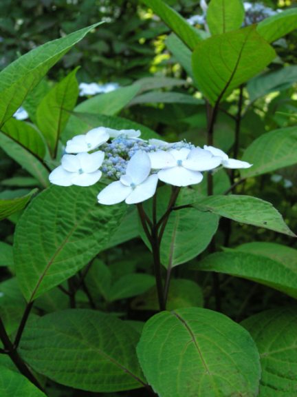 Diese beliebten Pflanzen sind eigentlich nur für milde Regionen geeignet. Die Knospen der Hydrangea serratas sind auch spätfrostgefährdet aber für verlorene Knospen bildet die Pflanze Ersatz, zumindest bei der ´Bluebird ist das so. Den am jungen Holz blühenden H. arborescens und paniculata kann der Spätfrost nichts anhaben.Hier ist Hydrangea serrata ´Ramis Pictis´ mit weißen Scheinblüten und blauer Blütenmitte und dunkelroten Blütenstielen.