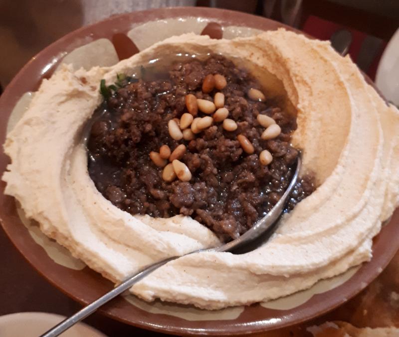 Das war Lammhack. Ich habe aber nur vom Hummus genommen, das ausgesprochen gut gewürzt war. Meine Begleiterin war von dem Fleisch aber auch ganz angetan.