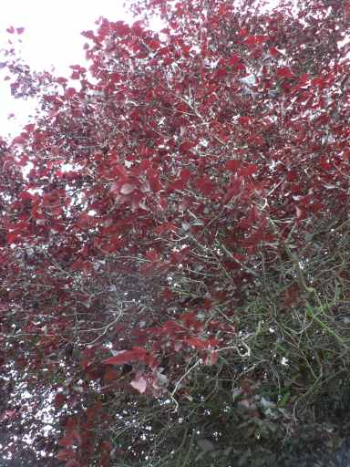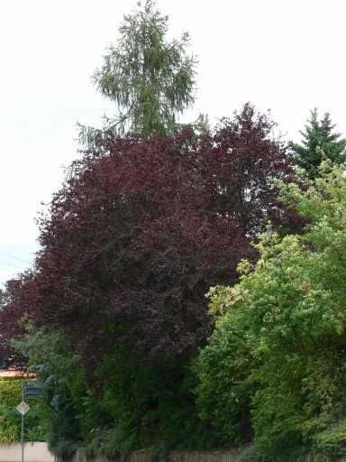 Da ich so von der Blutpflaume geschwärmt habe, wollte ich auch noch Fotos nachreichen, die ich heute auf einem Spaziergang gemacht habe. Wie gesagt, man sieht sie hier öfters in älteren Gärten - so wie hier: