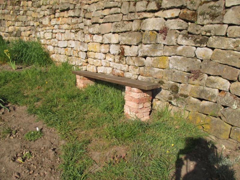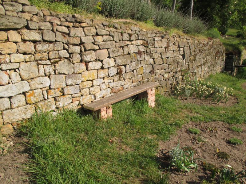 Am Wochenende habe ich die geplante Bank realisiert. Ein dickes Brett war da, Backsteinziegel habe ich hoch gebracht.