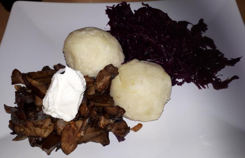 Dann gabs die Woche den Rest Klöße und Rotkohl von Weihnachten, dazu Waldpilze mit Schmand