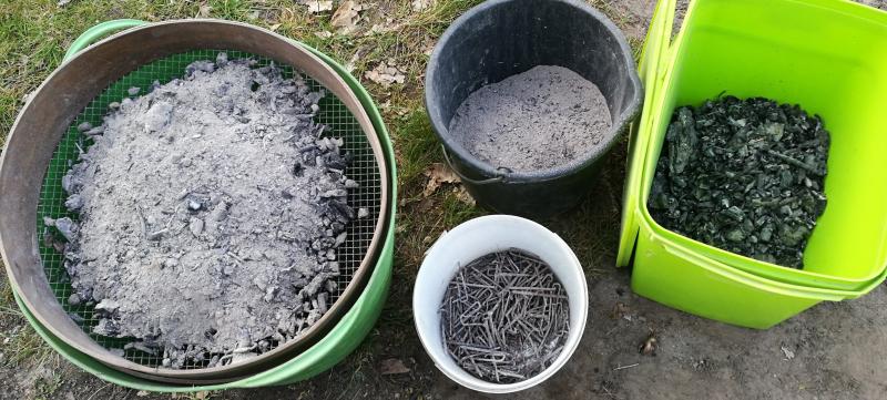 Der große Berg Reste aus der Verfeuerung der letzen Wochen ergab 50 Liter Asche und Erde, 15 Liter Holzkohle und 2 Liter Metall.