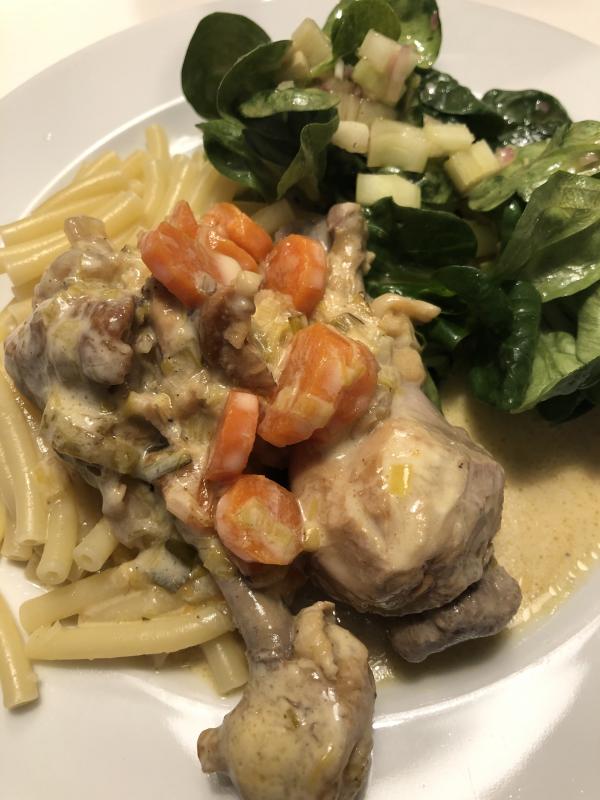 Kleine Hühnerkeulen geschmort mit Karotten, Lauch und Weißwein. Dazu dann Nudeln und Ackersalat mit Staudensellerie