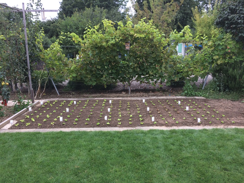 Hier ist die Taktik dieses Jahr wieder eine andere. Es wurden zur absoluten Unzeit Ende Juli bei viel zu warmen Temperaturen verschiedene Salat Zuchtlinien ausgesäht (noch nicht vollständig gezüchtete Sorten), welche das Potential haben sollen, mal in den Bioanbau zu drängen.