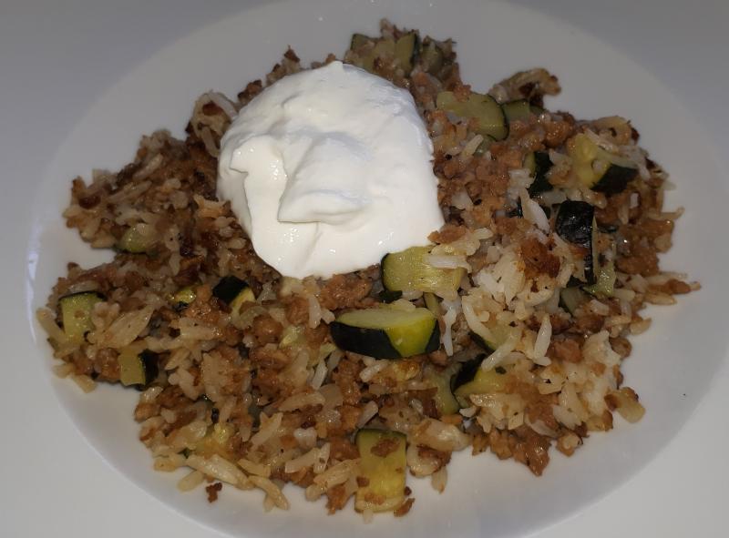 Gebratener Reis mit Tofu-"Hack", Zucchini, Zwiebeln und Knoblauchquark, Gurkensalat