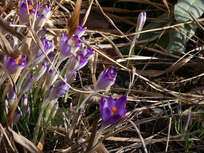 In einer kleinen, schattigen Ecke an Nachbars Zaun breiten sie sich hier auch aus (besser als sonstwo im Garten). Die Ecke vergesse ich immer, beim Laubabräumen. Als ich vor kurzem dort Eichenlaub wegsammelte, lagen schon einige Krokusse flach darunter. :-[ Zum Glück berappeln sie sich schnell.