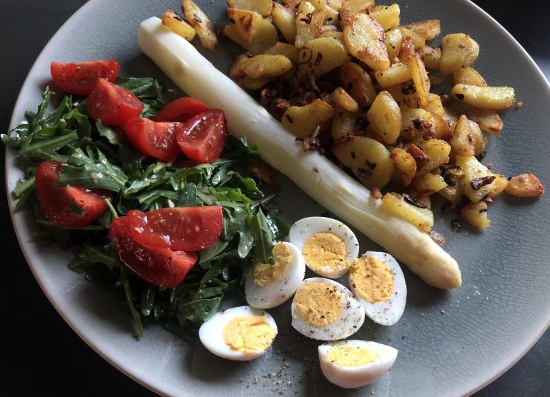 Bei uns gab es heute eine komische Kombination, die aber geschmeckt hat: Ein Restspargel von gestern, Bratkartoffeln, Wachteleier, Ruccolasalat mit Tomaten.