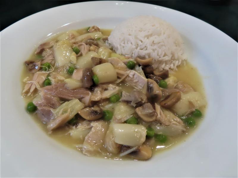 Und heute dann das Frikassee. Sehr sehr sehr gut :D Zwei Hühnerhaxn und eine Tasse Rücken für die Suppe, dazu ein paar Wurzeln; kleine weiße Champigons und ein paar TK-Erbsen, schon wegen Grün. Fürs erste Mal gelungen :)