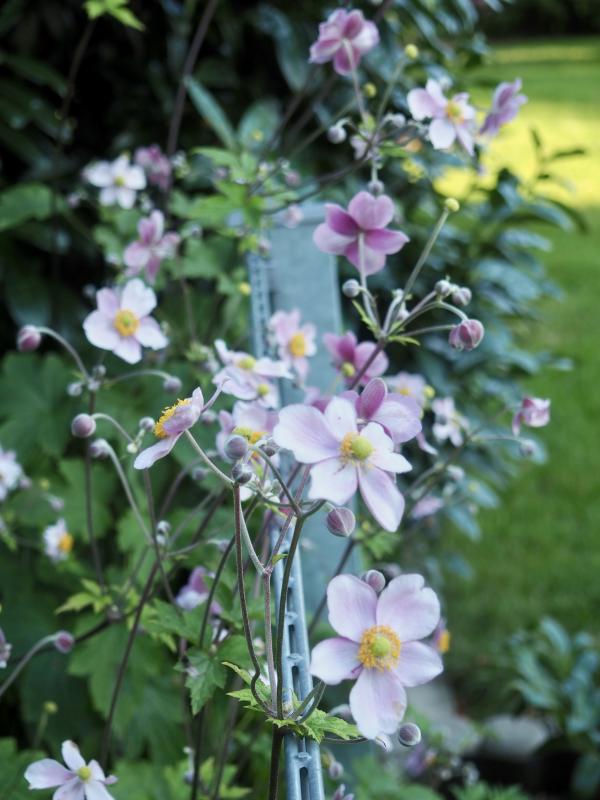 Bei mir haben die Herbstanemonen durch die vielen Gehölze an den meisten Plätzen doch etwas zu wenig Licht und blühen deshalb nicht so überreich. Oder sie neigen sich in die Richtung, von der die meiste Sonne kommt. Wie hier. Robustissima am Gartenzaun zum Nachbargrundstück. Ob die lieber dort wäre... mehr Rasen, wenig Gehölze, mehr Licht.