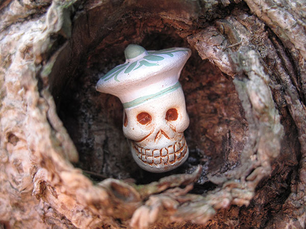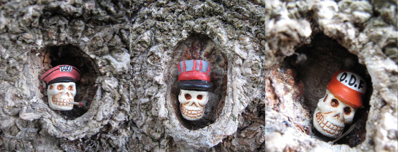 Hier sieht man es besser.Das sind 2-3 cm große Minischädel aus Mexiko (--> http://de.wikipedia.org/wiki/Tag_der_Toten ). Die passen perfekt in die Astlöcher hinein.