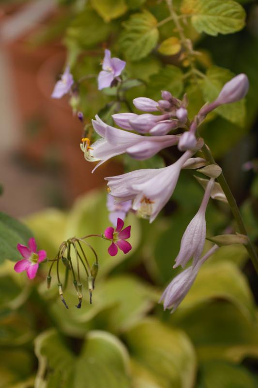 Spätblühende Oxalis lasiandra mit Hosta und Fugensämling Tinantia