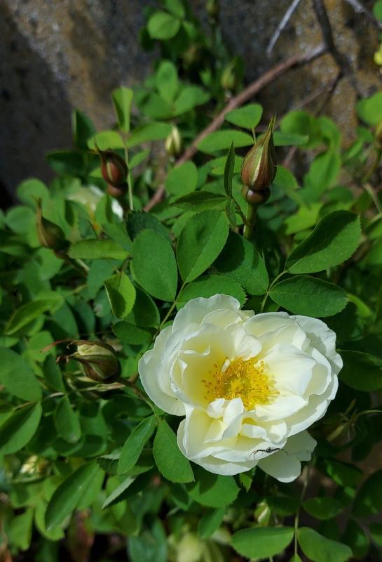 An der Terrasse begeistert mich immer wieder Fortune's Double Yellow, die Kamera kriegt leider die 2 Farben nicht so lebhaft aufs Bild. Nachdem ihr jetzt das Treppengeländer wegen dem gewachsenen Apfelbaum zu schattig ist, wächst sie lieber am Baum hoch. :-\