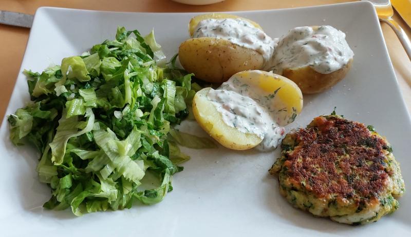 Pellkartoffeln mit Kressequark, Zucchini-Halloumi Bratlinge und Salat