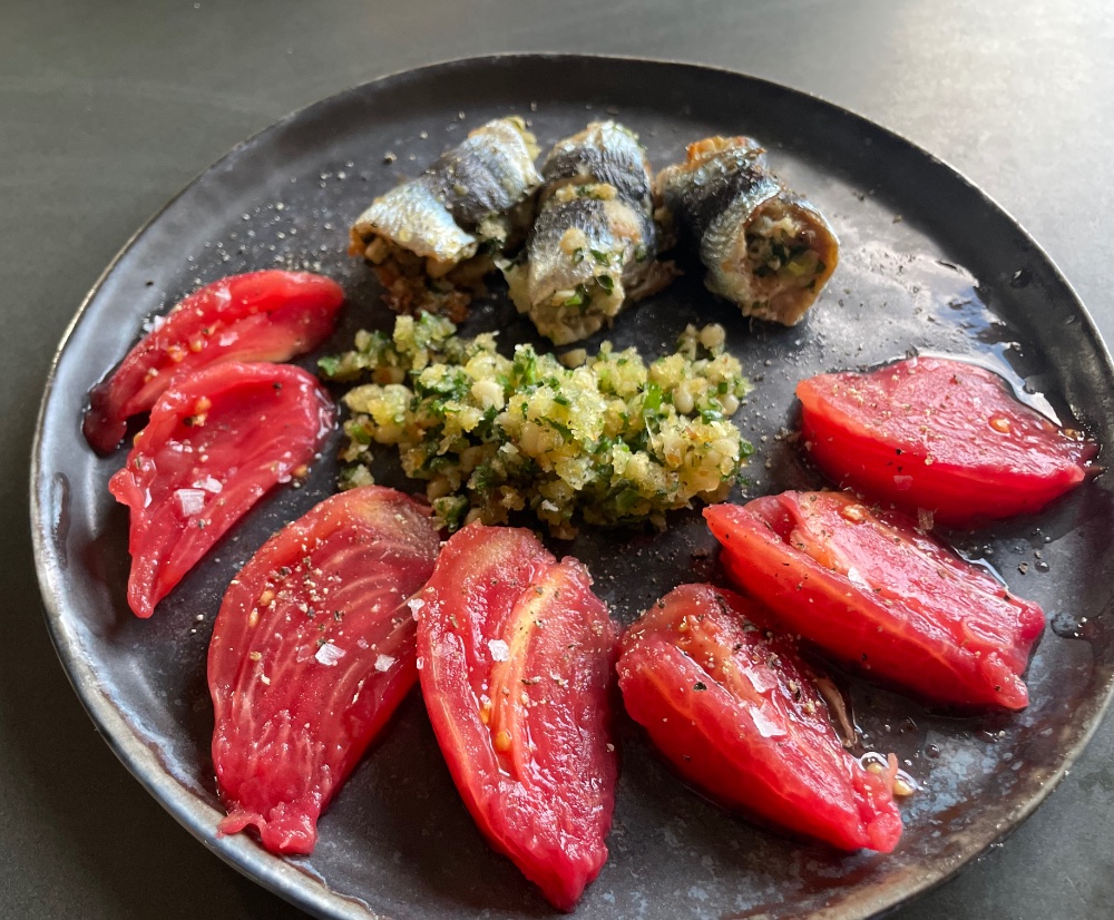 Heute vorweg eine Miniportion Sardinen gefüllt mit Semmelbröseln, Petersilie, Knoblauch, Zwiebel und Pinienkernen und dazu eine gehäutete vollreife Di Catenna Tomate.