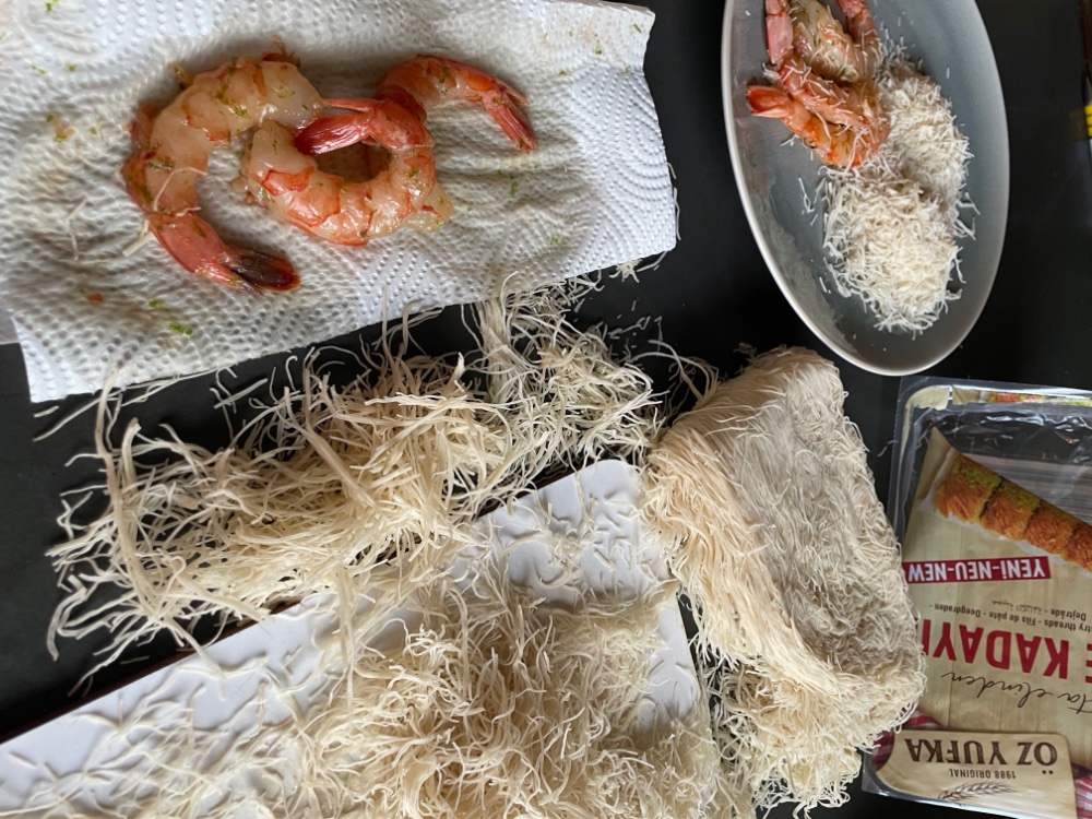 Danach wollte ich Garnelen mit Kadayif Teigfäden einwickeln und frittieren. Das hat leider gar nicht geklappt.