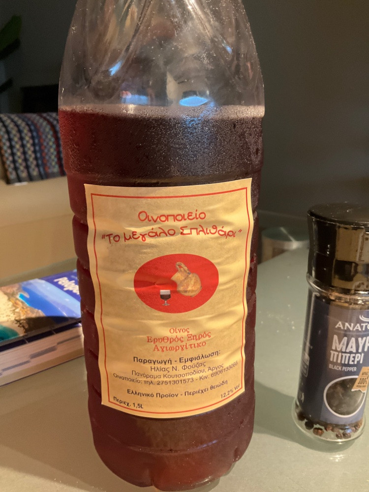 Und noch die Weinbegleitung: ein Agiorgitiko, Rosé, wenn ich das Etikett richtig entziffert habe aus Argos, mit einem sehr attraktiven Preis-Leistungsverhältnis, 3,50€ für 1,5 Liter. Agiorgitiko ist angeblich eine der ältesten Rebsorten der Welt.