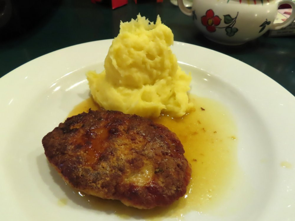 Hier gab es Hühnerbutterschnitzl (mit Anchovis, Kapern, Zitronenschale) mit Erdäpfpürree und Endiviensalat - vorbeugende Schonkost vor der C-Impfung, Nebenprodukt Hühnersuppe für den Saft und abends. Hat besser geschmeckt als es ausschaut.