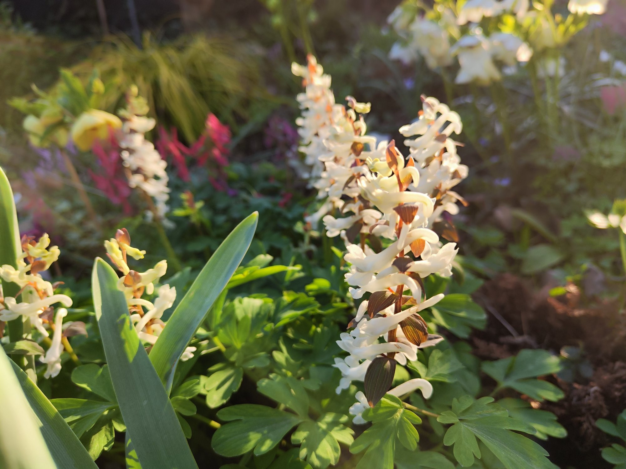 Traubenhyazynthen mit Corydalis , farblich durchaus harmonierend . Narzissen, die sich zwischen Gehölzen und liegengebliebenen Schnittgut behaupten. Leberblümchen.