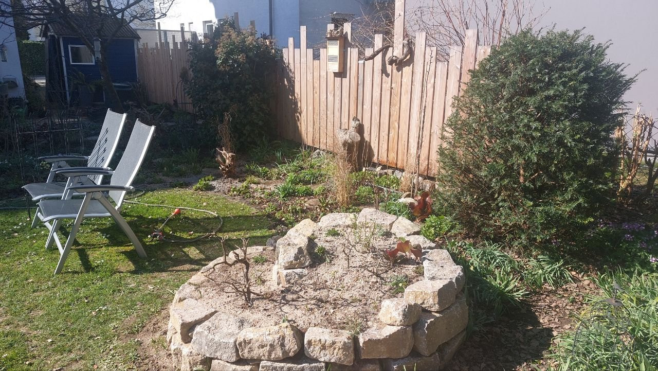 Auf der anderen Seite ist die Steinspirale fertig und bepflanzt. Muss natürlich erstmal einwachsen. Die Wisterienzweige sind der Katzenschutz, da sie als Klo missbraucht wurde und meine Pflanzen durch die Gegend flogen.