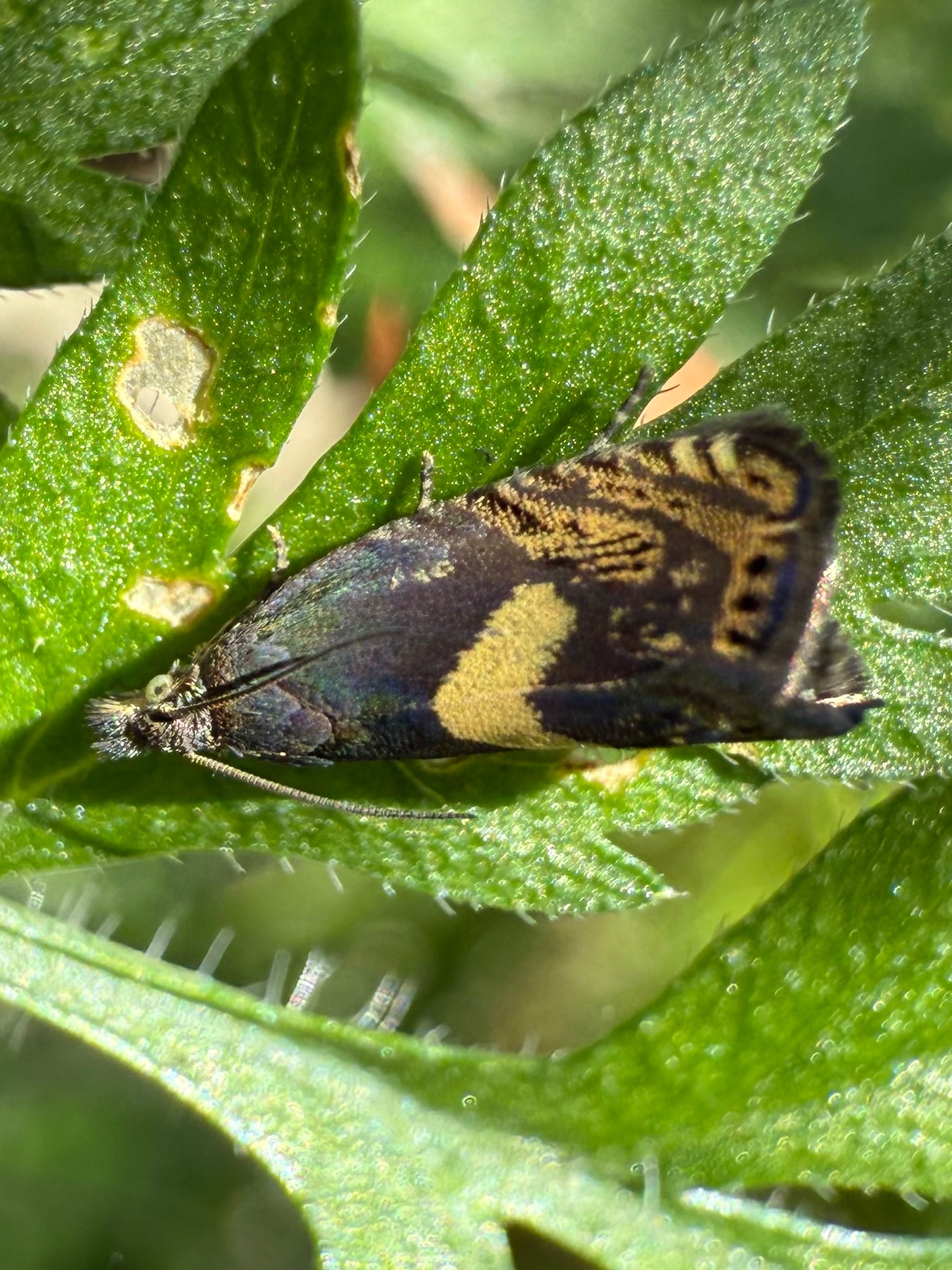 Dieser Winzling lässt sich dank des markanten Muster auf den Vögeln etwas besser bestimmen und ist aller Wahrscheinlichkeit der Mondfleckige Scharfgarben Wickler.