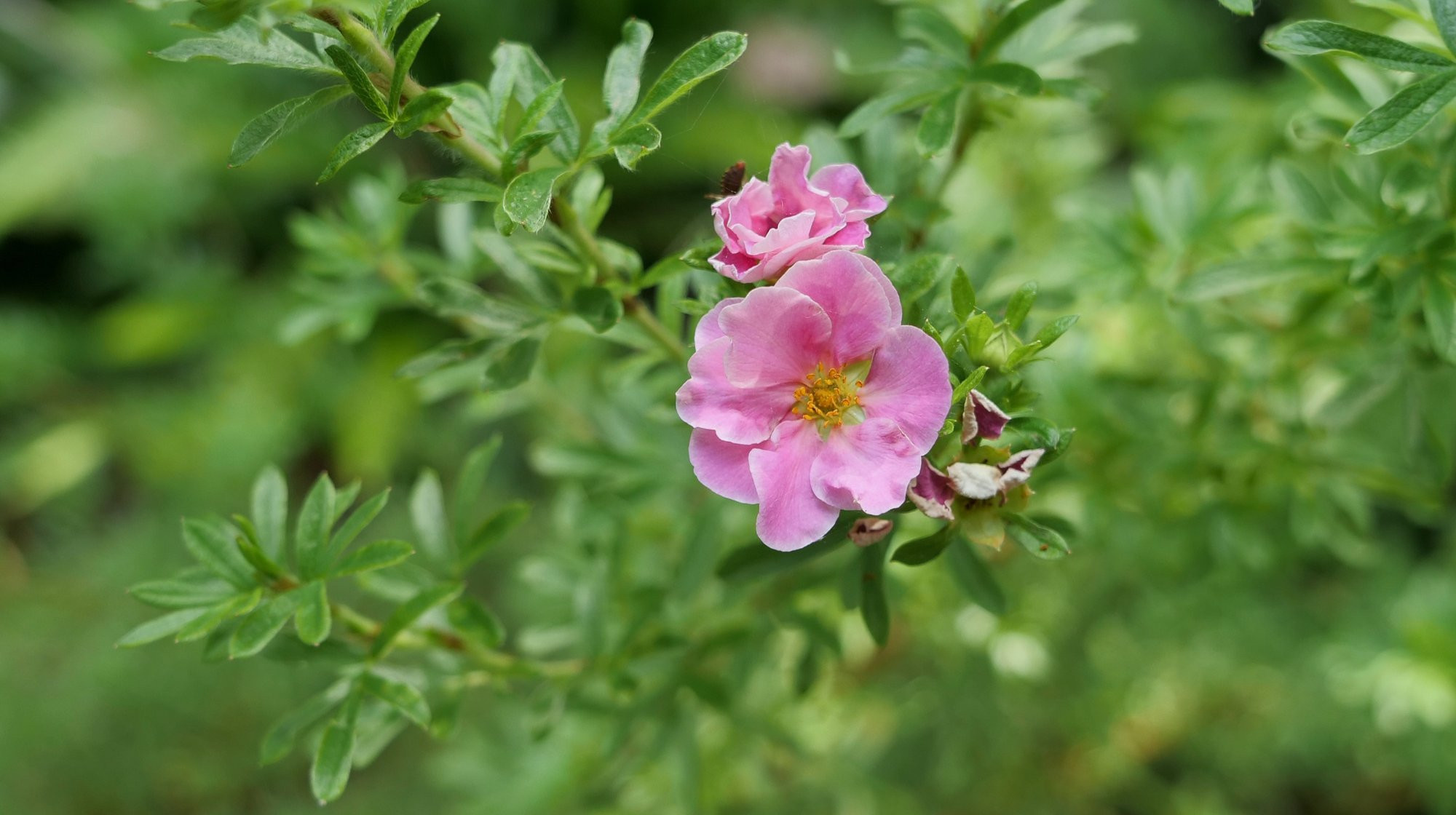 Weisse und rote Erdbeerblüte. Echinacea in den letzten Zügen.