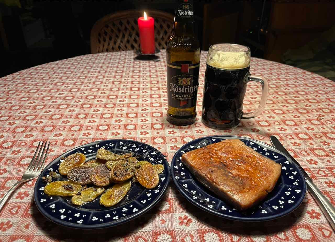 Grober Münchner Leberkäs abgebräunt sowie schnelle Bratkartoffeln aus rohen Drillingen mit Schalotte und Kümmel und bestreut mit Majoran ganz unbayerisch zu Köstritzer Schwarzbier.