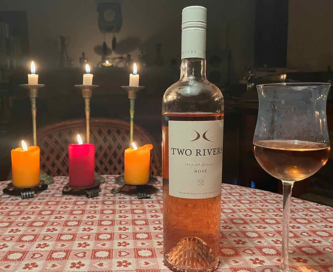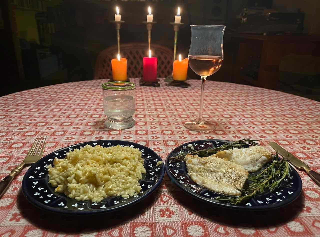 Zanderfilets mit Zitronensaft beträufelt, auf der Hautseite mit Pankomehl meliert und mit Olivenöl, Meersalzbutter, Knoblauch und Rosmarin gebraten sowie Carneoli-Risotto mit Schalotten und Weißwein zum Rosé 2019 "Ile of Beauty" aus Neuseeland.