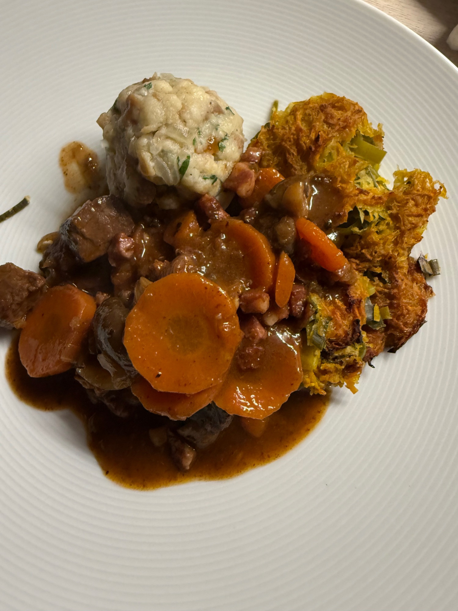 Am Sontag habe ich erste Mal Bœuf Bourguignon gekocht. Dazu gab es Kapü.