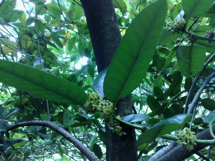 Ilex latifolia blüht seit ca.3 Wochen .Der Ilex wurde 1990 zwischen Koniferen gepflanzt.1995/96 erlitt er einen Frostriß an der Basis ,der auf 10 cm nur eine 'Brücke' von ca 20% des Stammumpfangs ließ,aber wundersamerweise überlebte die Pflanze.Die Wunde hat sich im Laufe der Jahre durch Überwallung völlig geschlossen und die Pflanze ist jetzt 3,5om hoch.Der Stamm ist im Hintergrund sichtbar.Es ist die weibliche Pflanze und im Herbst sieht man reichlich Früchte,da ich einen Ilex X koehneana als Pollilator ca.10m entfernt stehen habe.