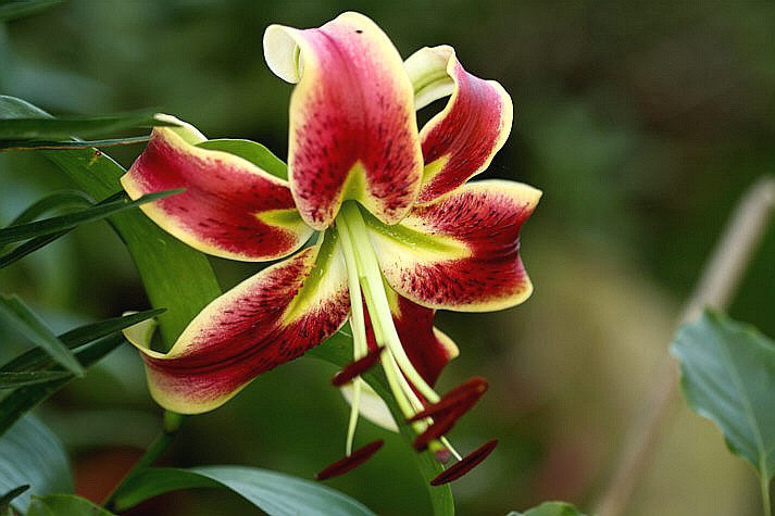 toll! ich würde auf lilium primulinum tippen. bei der poilanei soll sich die rotbraune färbung auf dem mittelstreifen der blütenblätter verlängern.
