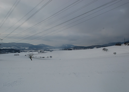 Heute Morgen Regen bei 3 Grad. Etwa die Hälfte des Schnees liegt noch.Gestern hats so ausgesehen: