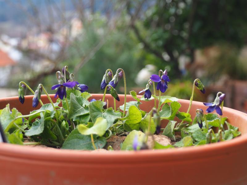 im Topf und mit super gutem Knospenansatz, Viola odorate 'Donau'. Blüten auf hohen Stielen. Gut für die Vase und guter Duft. Relativ dunkle Farbe.