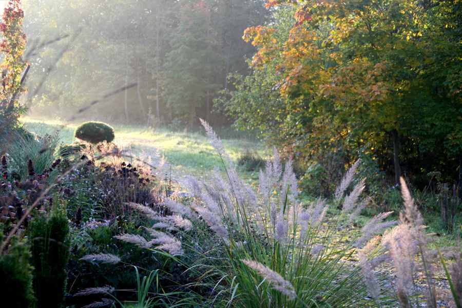 Der Blick über 3 Gartenbereiche: Kiesbeet mit Pennisetum im Vordergrund, Asternbeet ("Lichtbeet") in der Mitte, Waldgarten im Hintergrund