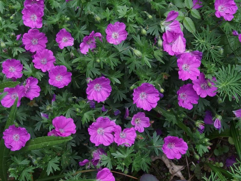 Im Elterngarten blüht ein Geranium sanguineum mit kräftig pinkfarbenen Blüten in kompakt-niedrigen Polstern, deutlich kleiner als z.B. G. s. 'Album'.