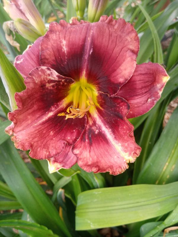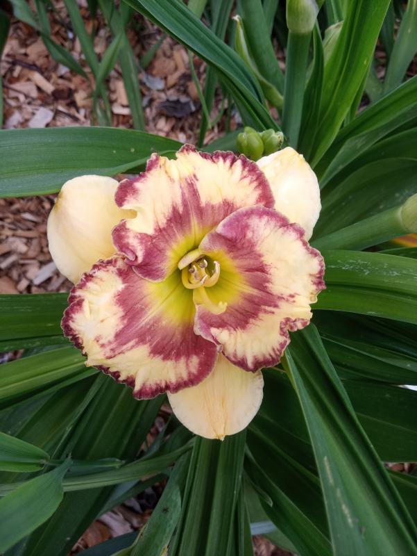 Meine einzige Sorte mit white toothy edge ist 'Men in Black' (Petit 2010), von der ich bisher nur dieses Regenfoto habe. Sie büht erst ca. Mitte Juli.