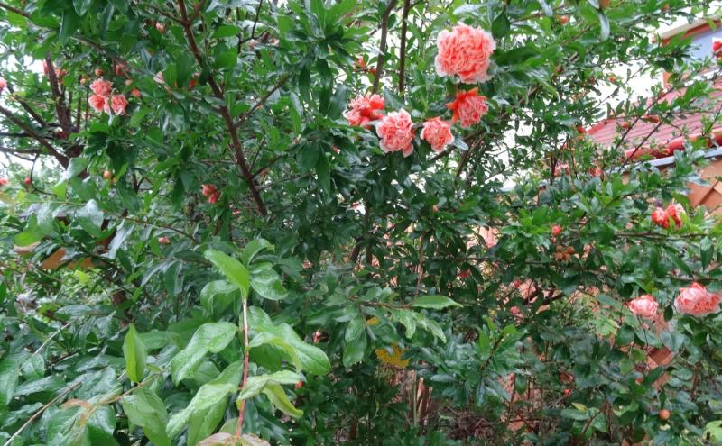 Hier hat es nicht nur nicht geregnet, auch die Zisterne ist leer. Ansonsten ist der blühende Strauch mit ziemlicher Sicherheit ein Zier-Granatapfel. :) Michael