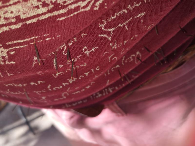 Die Samen blieben im T-Shirt stecken (Bild) und verteilen sich so wohl im Garten.