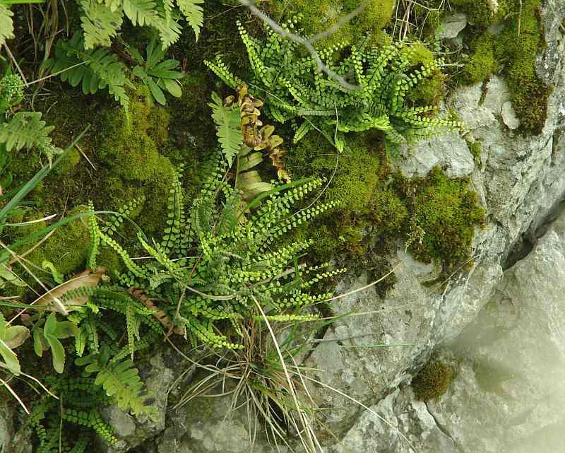 Asplenium trichomanes. Dazwischen sitzt offenbar noch ein Polypodium vulgare.