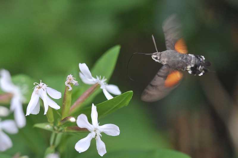 Und pünktlich kurz vor neun Uhr wie jeden Abend, nach dem kann man echt die Uhr stellen, das Taubenschwänzchen im Seifenkraut.