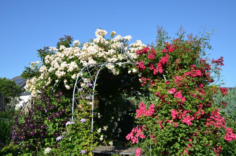 Hier dominieren derzeit die Rosen das Geschehen, vor allem am Pavillon.