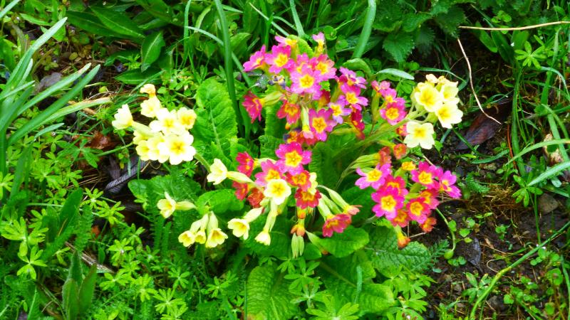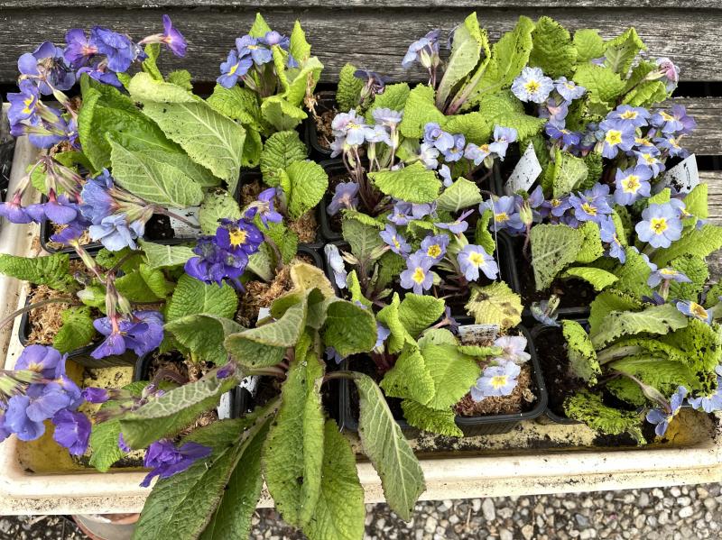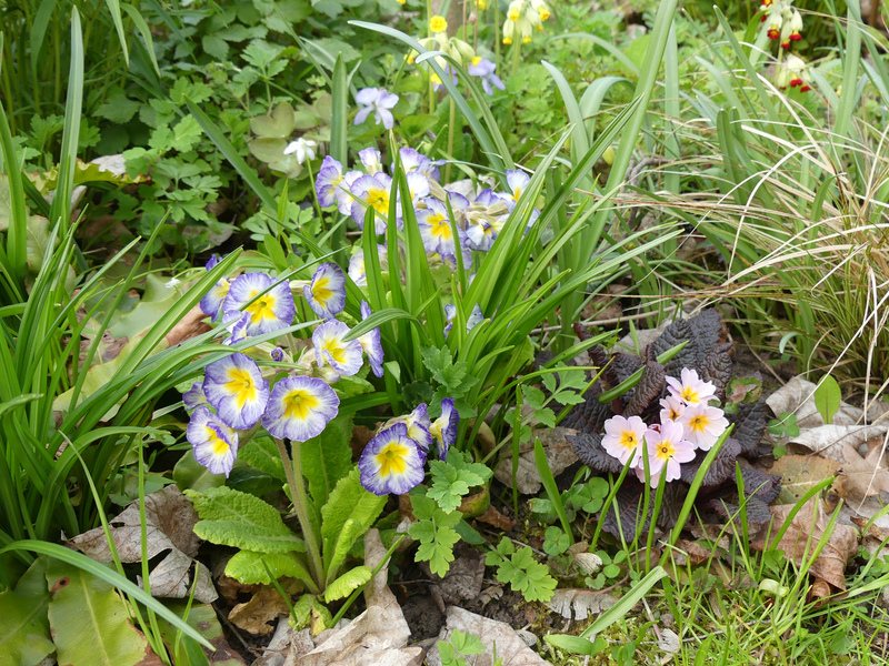 Noch ein Foto aus der Primelecke. Die blaue, ein Sämling von Barnhaven, scheint sich selbst schon versamt zu haben. Bei der dunkellaubigen daneben müsste ich erst schauen, wer's ist.