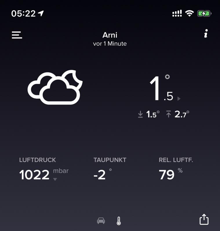 Bei mir waren es +1,5°C in 270m Seehöhe (10m über dem Boden im 3. Stockwerk am Südbalkon) siehe Attachment.
