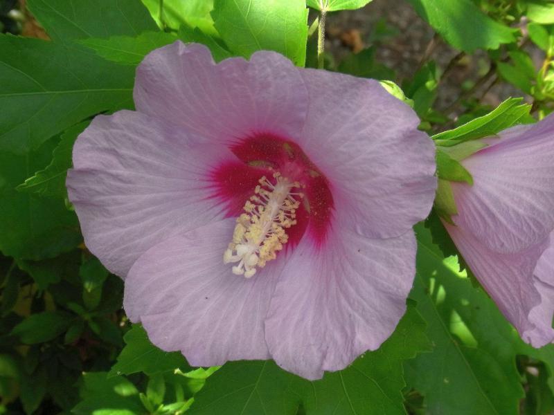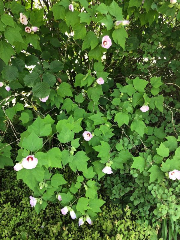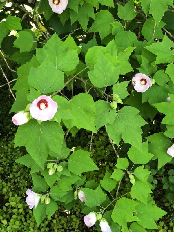Dieser Strauch gibt mir ein Rätsel auf. Sieht aus wie Abutilon, ist aber ausgepflanzt und in 6b/7a winterhart. Oder Hibiscus?