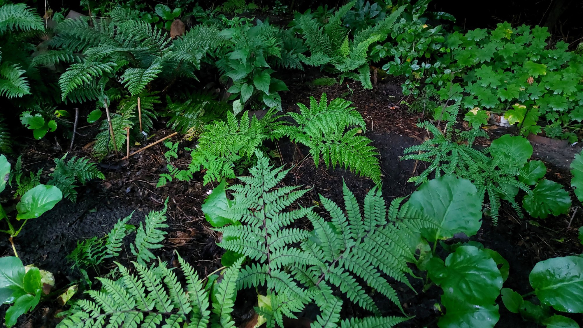 Ein paar Farne heute Abend nach Ende des Regens - der Rotschleierfarn hat seinen roten Schleier komplett abgelegt.