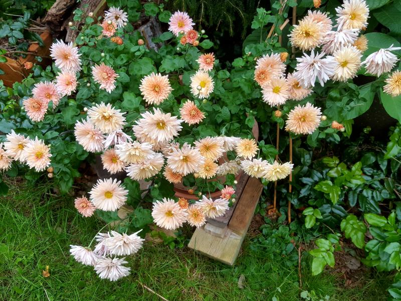 Hier blüht Chrysanthemum " Esther " unermüdlich seit Ende August, verschiedene Farbschattierungen von Apricot bis rosa bei den Blüten.