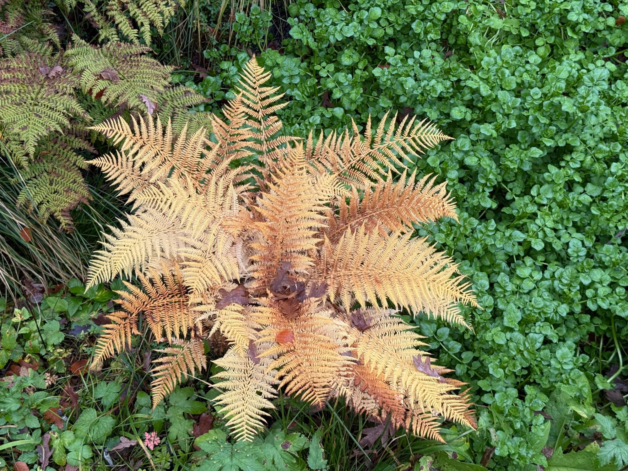 diese färbung ist wirklich atemberaubend, großes kino! macht diese pflanze das jedes jahr, und nur diese? dann wäre das dringend ein absporungskandidat – athyrium filix-femina 'kupferherbstlicht' oder so. ;)