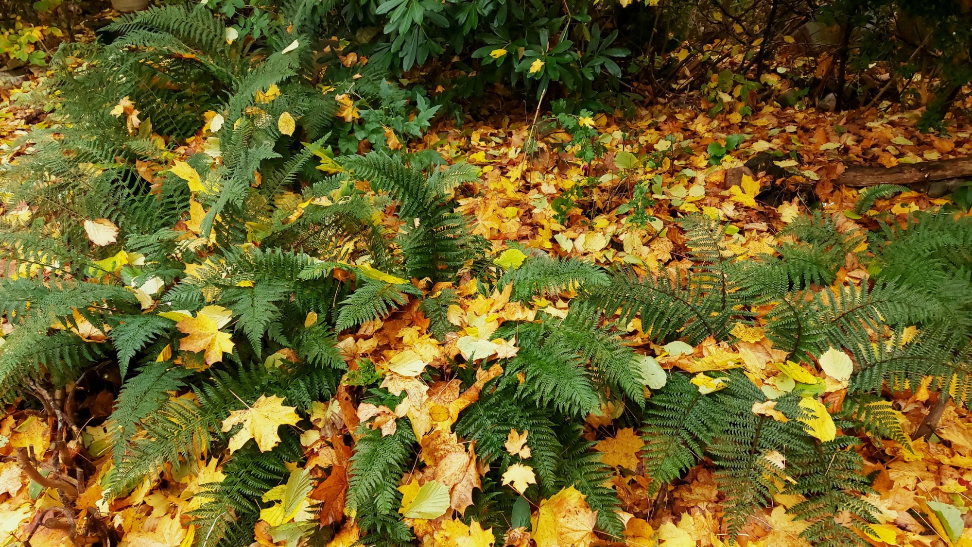 Hier haben die Farne noch eine deutlich grünere Farbe, eingebettet in Ahornlaub.